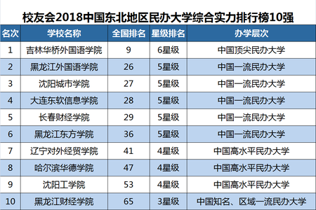 正在最新校友会2018中国平易近办大学排行榜150强中,华桥外国语学院、外国语学院、沈阳城市学院、大连东软消息学院、长春财院、东方学院、辽宁对外经贸学院、华德学院、沈阳工学院、财院名列校友会2018东北地域平易近办大学分析实力排行榜前10强。武昌首义学院位居校友会2018中国平易近办大学排行榜榜首,文华学院第2,山东英才学院第3,西安欧亚学院第4,三亚学院第5,山东协和学院第6,郑州工商学院第7,武汉学院第8,西安培华学院和华桥外国语学院并列第9。